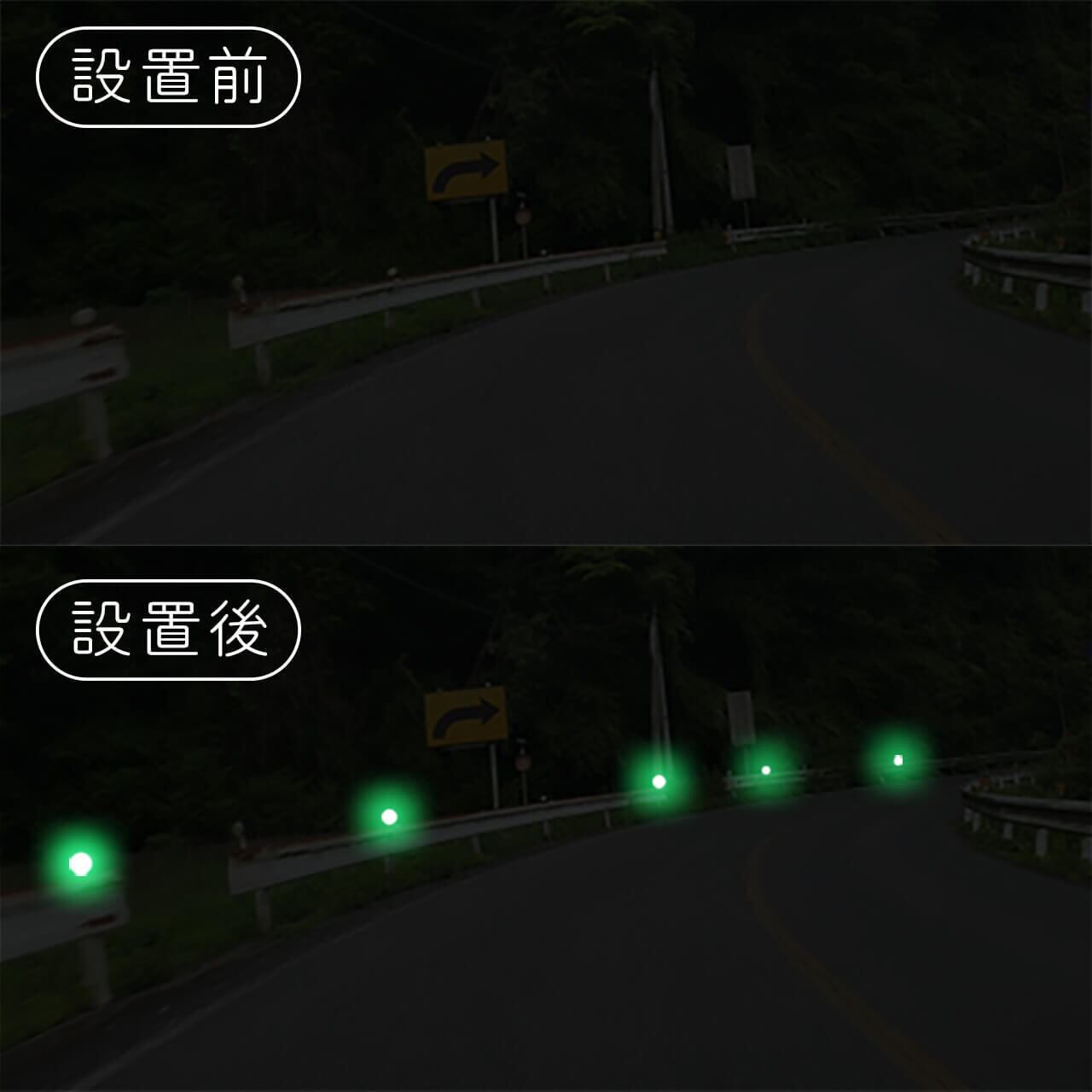 夜間や道路カーブでの設置イメージは、【画像4枚目】の使用例写真をご確認ください。